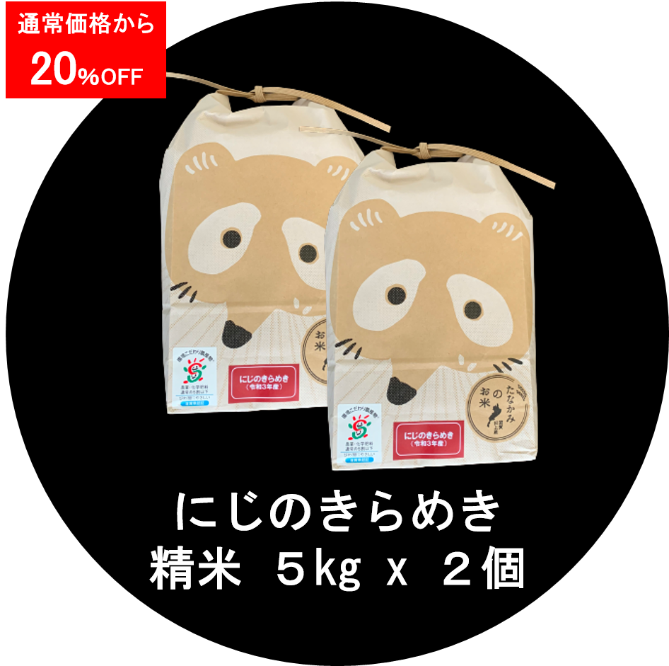 ご家庭の食卓に精米したてのお米を ご家庭でもお楽しみいただけるよう、かわいいたぬきのクラフト袋入りをご用意いたしました。 ご注文ごとに、発送直前に精米し、「たなかみのお米」本来のおいしさをお届けいたします。 たなかみ米の魅力 水と土にめぐまれた米どころ 琵琶湖の南に位置する田上(たなかみ)。 信楽の山々より流れ着く大戸川の美しい水、かこう岩系の土、盆地特有の寒暖差のある気候にめぐまれた土地で、1300年の間、より美味しくお米を育てる工夫を続けてきました。 100%田上産のコシヒカリ おいしいお米を作るためには、田植え・収穫にとどまりません。 安心でおいしいお米を食べていただけるように、土づくりからスタートし、商品を開発・管理・保管・発送までの全行程を私たち自らおこないます。 美味しいの先にあるもの 田植えを通じた食育、農薬と化学肥料を抑えた特別栽培米などの、環境にも人にもやさしい農業に取り組んでいます。 安心・安全・美味しいお米を届けるだけでなく、その先にあるものを常に考えます。 環境こだわり農産物合言葉は「食べることで、びわ湖を守る。」 滋賀県では、琵琶湖をはじめとした自然環境の保全に配慮した「環境こだわり農業」によるお米づくりが広がっています。集落ぐるみによる「農地・水・環境保全」活動をベースとし、農作物だけではなく、農地や水を守る環境に配慮した栽培方法です。 長谷工あんしんデリは、「環境こだわり農産物」として滋賀県に認証されたお米をより安全・安心な農産物として販売しております。 ご家庭用「にじのきらめき」 精米10kg<キャンペーン> ツイートする シェアする 販売価格 8,472円(税込み) 会員価格 (税込み) 通常価格 10,590円(税込み) 在庫 11 商品コード B07KK004 JANコード 数量 - + カートに入れる 便種 宅急便 ******************************お米の保存期間 …お米は生きていて、常に呼吸をしています! お米も野菜と同じように鮮度が大切です。精米された状態で時間が経てばどうしても味は落ちてしまいます。 適量をこまめに買うことが秘訣です。目安として、冬場なら2カ月以内、春秋なら1カ月、暑い夏場ならば2週間以内に食べきれるくらいの量を購入されることがおすすめです。